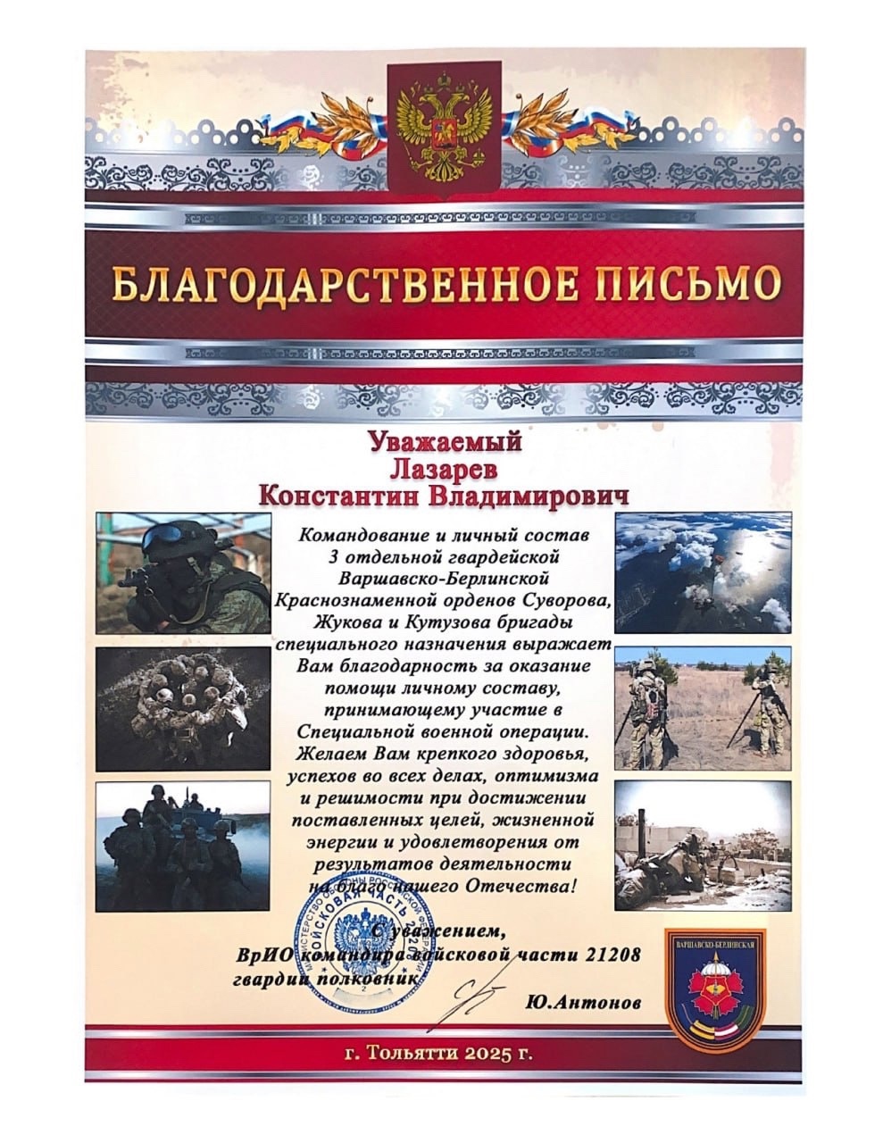 «Уважаемый Лазарев Константин Владимирович! Командование и личный состав 3-й отдельной гвардейской бригады специального назначения выражает Вам благодарность за оказание помощи личному составу, принимающему участие в Специальной военной операции. Желаем Вам крепкого здоровья, успехов во всех делах, оптимизма и решимости при достижении поставленных целей, жизненной энергии и удовлетворения от результатов деятельности».