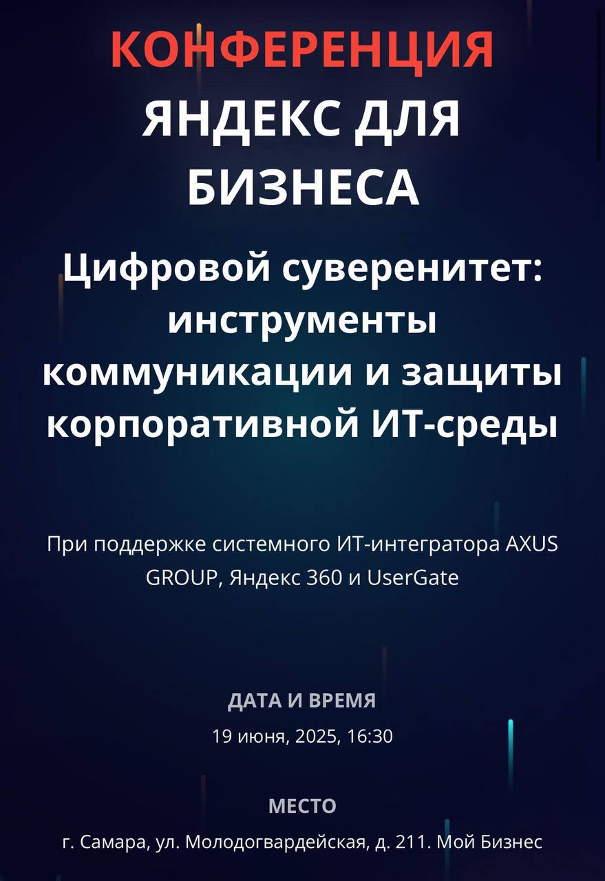 Мероприятие проводится при поддержке члена Самарского регионального отделения «Деловой России» — AXUS GROUP, а также Яндекс 360 и UserGate.